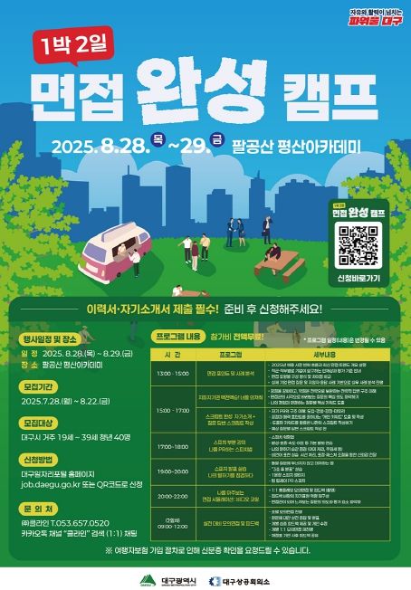 (아름다운교육신문) 대구광역시는 오는 8월 28일부터 29일까지 양일간 팔공산 평산아카데미에서 지역 청년 40명을 대상으로 ‘1박 2일 면접 완성 캠프’를 개최한다.