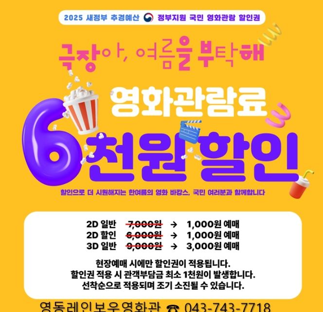 정영철 영동군수는 “무더위에 지친 군민들께서 시원한 영화관에서 저렴하게 문화생활도 즐기고, 휴식도 누리시길 바란다”며 “앞으로도 군민의 문화 향유 기회를 넓히고, 지역 문화시설 활성화를 위한 다양한 정책을 꾸준히 추진하겠다”고 밝혔다.