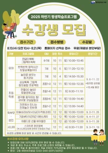 (아름다운교육신문) 횡성교육도서관은 9월 2일부터 11월 28일까지 지역 학생과 주민에게 다양한 문화예술 활동의 기회를 제공하고자 ‘2025년 하반기 평생학습 강좌’를 운영한다.