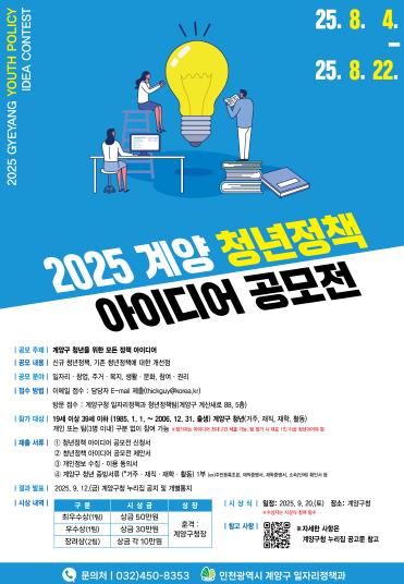 (아름다운교육신문) 인천광역시 계양구가 청년들의 참신한 생각을 정책으로 실현하기 위해 ‘2025 계양 청년정책 아이디어 공모전’을 개최한다.