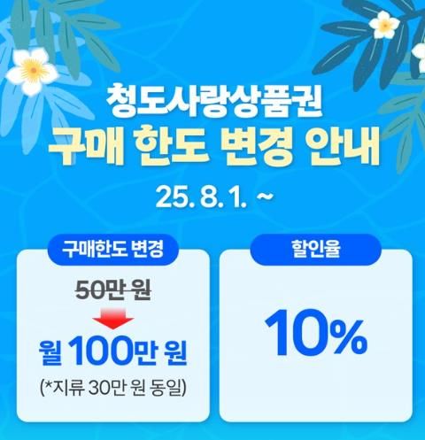 (아름다운교육신문) 청도군은 군민들의 소비 여력을 높이고 지역경제 활성화를 위해 오는 8월 1일부터 청도사랑상품권의 월 구매한도를 기존 50만원에서 100만원으로 상향한다고 밝혔다.