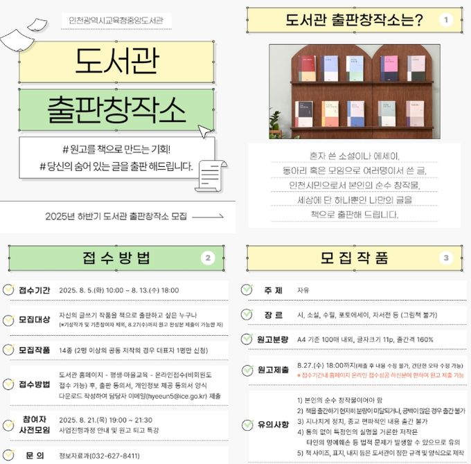 2025년 하반기 모집은 출판 경험이 없는 인천 시민 누구나 참여할 수 있으며, 시·소설·수필·포토에세이·자서전 등 다양한 장르의 작품을 접수한다.