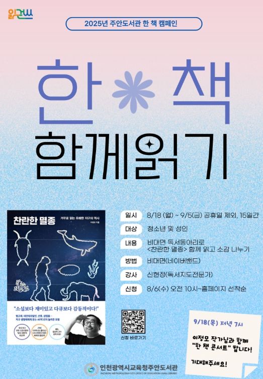 (아름다운교육신문) 인천광역시교육청주안도서관은 2025년 ‘한 도서관 한 책’ 캠페인의 일환으로 ‘SNS 한 책 함께 읽기’ 프로그램을 오는 8월 18일부터 9월 5일까지 운영한다고 밝혔다.