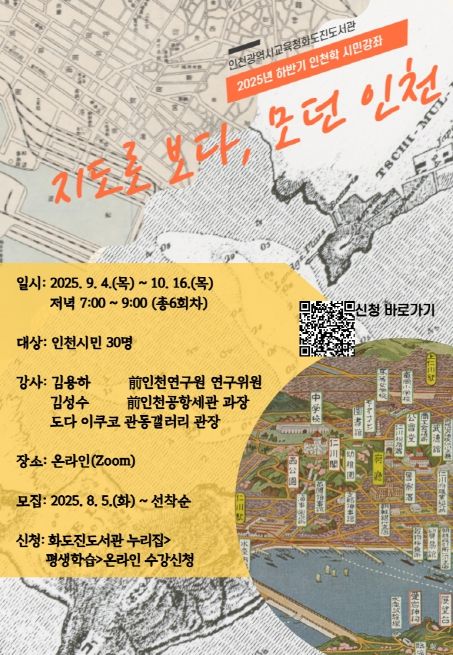 (아름다운교육신문) 인천광역시교육청화도진도서관은 개항기부터 현대까지 인천의 도시 변화와 생활상을 지도를 통해 살펴보는 ‘지도로 보다, 모던인천’을 주제로 2025 하반기 인천학 시민강좌를 운영한다.