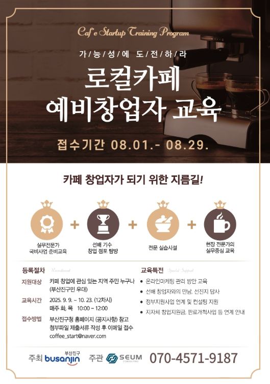 (아름다운교육신문) 부산 부산진구는 오는 9월부터 부산진구 지역맞춤 특화 창업지원 사업으로 ‘2025년 하반기 부산진구 로컬카페 예비창업 2차 과정’을 운영한다고 밝혔다.