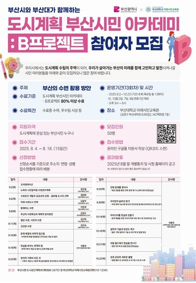 (아름다운교육신문) 부산시는 부산대학교(미래시민교육원)와 함께 오는 9월 2일부터 10월 23일까지 '도시계획 부산시민 아카데미:비(B)프로젝트'를 운영한다고 밝혔다.