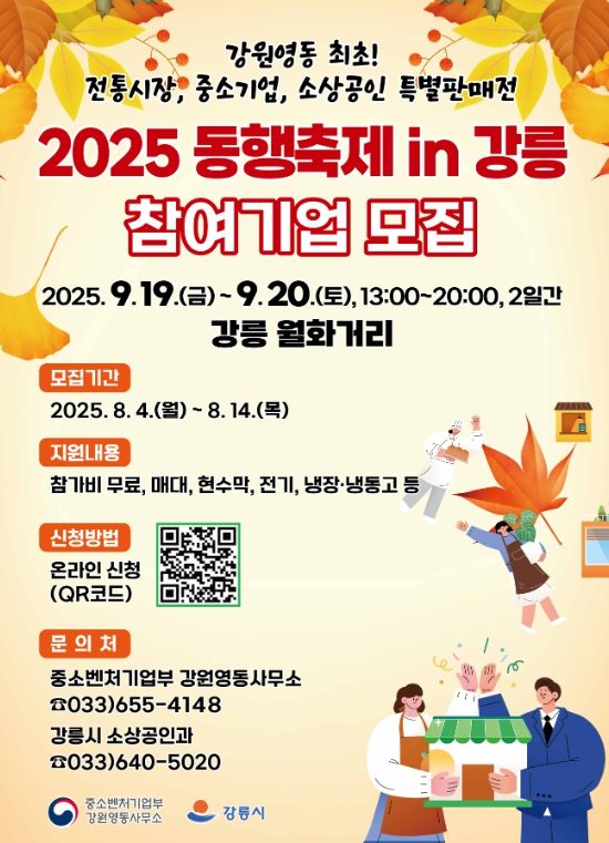 (아름다운교육신문) 강릉시와 중소벤처기업부(강원영동사무소)가 오는 8월 14일까지 중소기업·소상공인 특별판매전인 ‘2025 동행축제 in 강릉’에 참여할 우수 중소기업 및 소상공인을 모집한다.