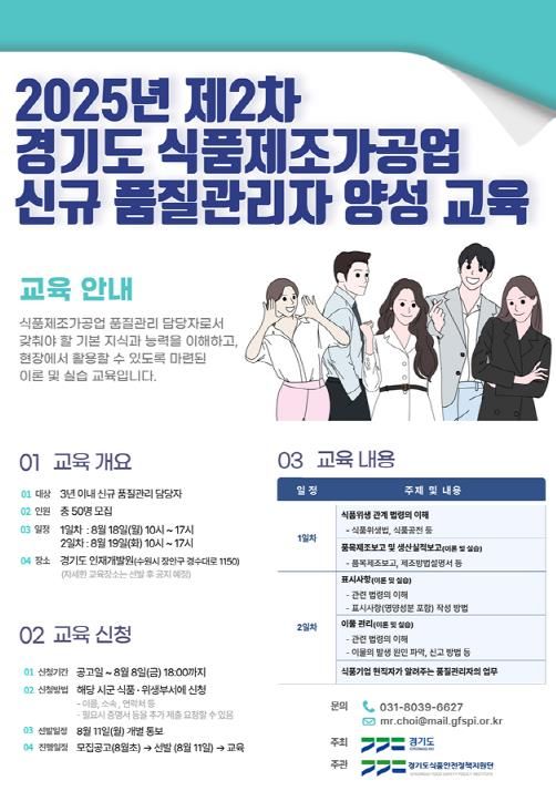 (아름다운교육신문) 경기도는 오는 8월 18일부터 19일까지 이틀간 경기도인재개발원에서 `2025년 제2차 경기도 식품제조가공업 신규 품질관리자 양성 교육`을 추가로 실시한다.