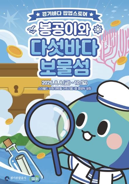 먼저, 경기바다의 다채로운 여름 매력을 선보이는 차원에서 8일부터 10일까지는 스타필드 수원 1층 센트럴 아트리움에서 체험형 팝업스토어 ‘봉공이와 다섯바다 보물섬’을 운영할 예정이다.
