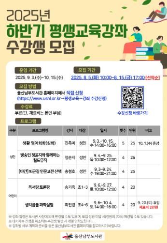 (아름다운교육신문) 울산남부도서관은 초등학생과 지역 주민을 대상으로 2025년 하반기 평생교육 강좌 수강생 115명을 모집한다.