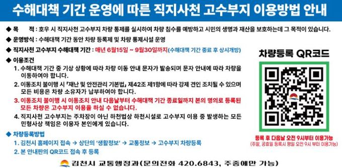 (아름다운교육신문) 김천시가 직지사천 고수부지 차량 침수 위험을 자동으로 알려주는 ‘차량 통제 시스템’의 원활한 운영을 위해 차량등록 신청 방법을 개선한다고 1일 밝혔다.