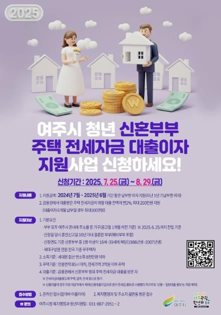 (아름다운교육신문) 여주시가 청년층의 정주여건 개선을 위해 청년 신혼부부에게 주택 전세자금 대출 이자지원 사업 신청접수를 지난 7월 25일부터 모집하여 오는 8월 29일까지 접수한다고 밝혔다.