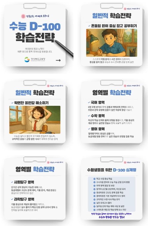 (아름다운교육신문) 경북교육청은 5일, 2026학년도 대학수학능력시험 D-100일을 맞아, 수험생들에게 실질적인 도움과 응원을 전하기 위해 응원 영상과 수능 학습 전략 자료를 제작해 도내 각 고등학교에 배부했다고 밝혔다.