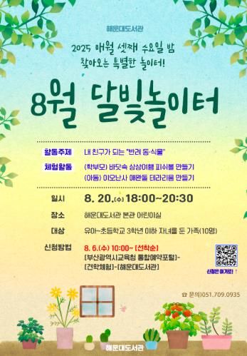(아름다운교육신문) 부산광역시립해운대도서관은 오는 20일 오후 6시부터 8시 30분까지 해운대도서관 어린이실에서 유아 및 초등학교 3학년 자녀를 둔 가족 10명을 대상으로 ‘8월 달빛놀이터’를 운영한다.