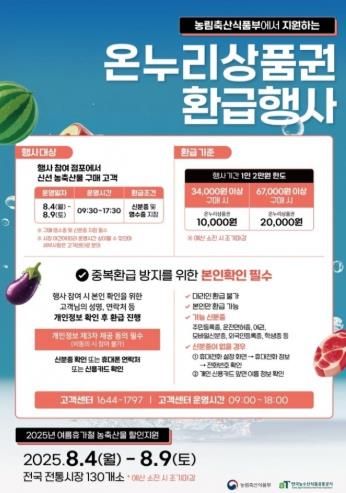 국산 농축산물 소비 촉진과 전통시장 활성화를 위해 명절에만 실시되던 환급 혜택을 여름철까지 확대한 것으로, 소비자에게 실질적인 혜택을 제공할 것으로 기대된다.