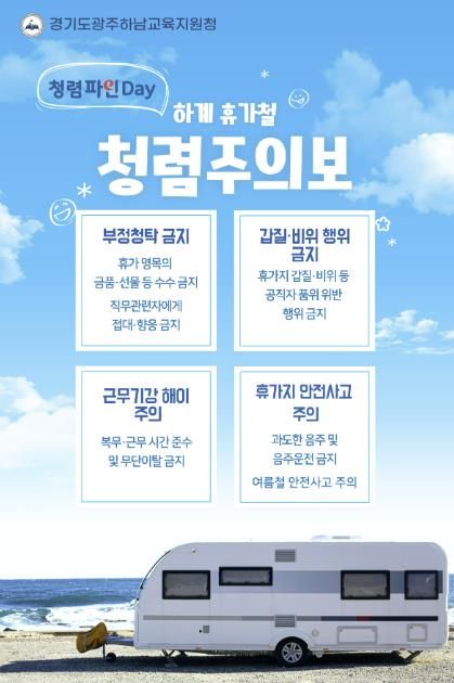 특히 청렴주의보에는 휴가 명목의 직무 관련 금품 수수 금지, 휴가지 내 갑질 및 비위행위 근절, 과도한 음주 및 음주운전 자제 등 공직자의 품위 유지와 안전사고 예방을 위한 실천 수칙이 포함됐다. 교육지원청은 이를 통해 공직사회의 신뢰 회복과 책임 있는 공직문화 정착을 독려하고 있다.