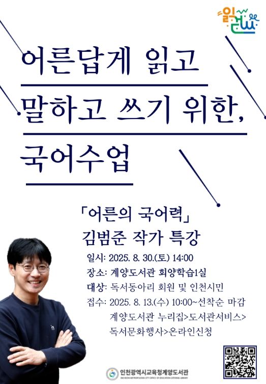 (아름다운교육신문) 인천광역시교육청계양도서관은 8월 30일 오후 2시 김범준 작가 초청 특강 ‘어른답게 읽고 말하고 쓰기 위한 국어수업’을 개최한다.