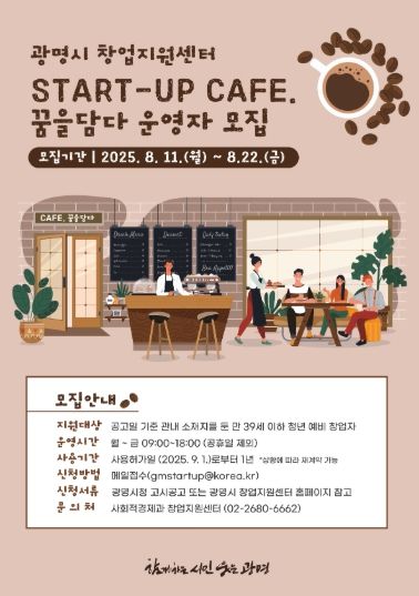 (아름다운교육신문) 광명시는 청년과 예비 창업자의 일자리 창출과 창업 활성화를 위해 창업지원센터(오리로 362, 2층) ‘스타트업 카페(START-UP CAFE) 꿈을담다’ 운영자를 8월 11일부터 22일까지 모집한다.