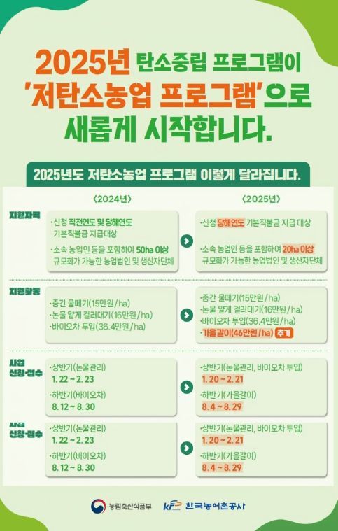 또한 ‘2025년 상반기 저탄소농업 프로그램(논물관리·바이오차 투입 등)’에 참여한 농가도 이번 가을갈이 사업에 중복 신청할 수 있다.