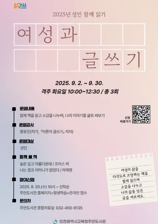(아름다운교육신문) 인천광역시교육청주안도서관은 9월 한 달간 ‘2025년 성인 함께 읽기–'여성과 글쓰기'’ 프로그램 참여자를 모집한다.