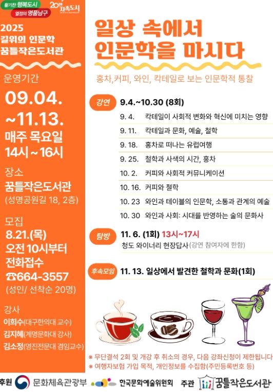문화체육관광부와 한국문화예술위원회가 공모사업으로 운영하는 이번 프로그램은, ‘일상속에서 인문학을 마시다’라는 주제로 9월 4일부터 11월 13일까지 진행된다.