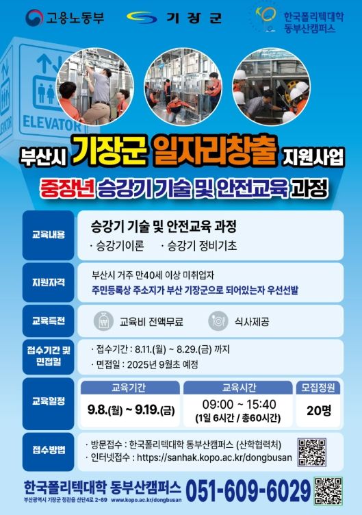 군은 ‘기장군 일자리창출 지원사업’의 일환으로 한국폴리텍대학 동부산캠퍼스와 협력해 ‘중장년 승강기 기술 및 안전교육’ 프로그램을 개설하고, 오는 29일까지 교육생을 모집한다.