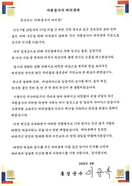 이 군수는 서한을 통해 "폭우로 피해를 입은 우리 군에 따뜻한 손길을 보내주신 여러분의 희생과 헌신 덕분에 주민들이 다시 일어설 용기를 얻고 있다”며 자원봉사 한 분 한 분의 수고와 열정이 우리 지역 사회를 더 따뜻하게 만들었다며 진심으로 감사하다고 밝혔다.