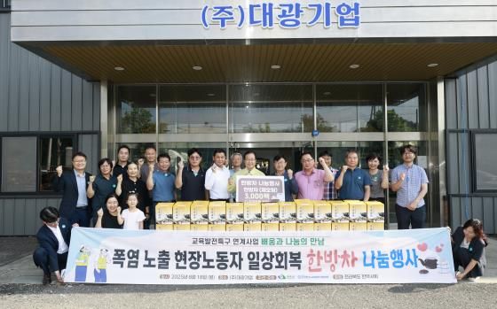(아름다운교육신문) 완주군이 지난 18일, 완주산업단지 내 ㈜대광기업에서 폭염에 노출된 산업현장 노동자들의 건강 회복과 심신 안정 등 온열질환 예방에 도움이 되는 한방차 나눔행사를 진행했다.