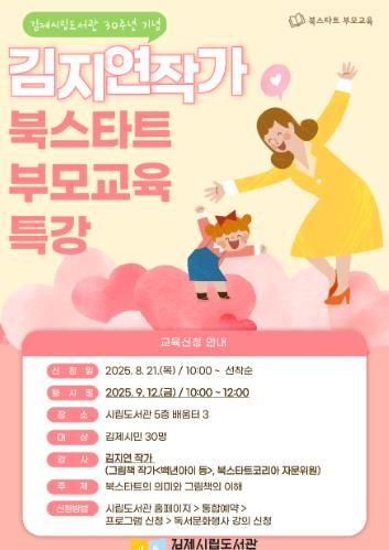 (아름다운교육신문) 김제시립도서관은 오는 9월 12일 오전 10시부터 김지연 작가를 초청해 북스타트 부모 교육 특강을 진행한다고 밝혔다.