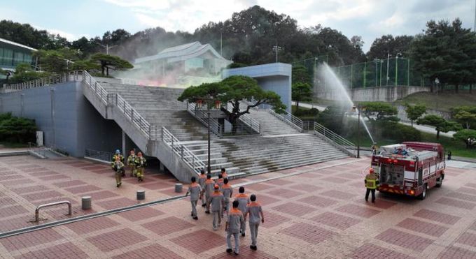 훈련은 정체불명의 테러범에 의한 국민체육센터 드론테러, 화재발생 상황을 가정해 상황전파, 테러진압, 인명구조, 화재진화, 응급복구 등 실전과 같은 상황이 현장감 있게 진행됐다.