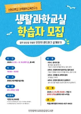 (아름다운교육신문) 인천광역시교육청중앙도서관은 8월 29일부터 9월 19일까지 초등학교 1~3학년을 대상으로 ‘2025 생활과학교실’을 운영한다.