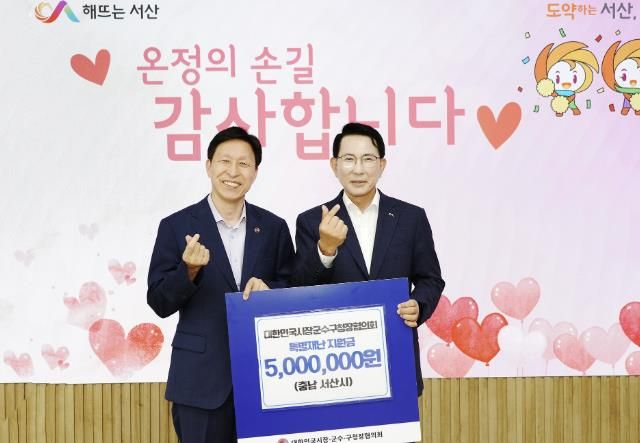 (아름다운교육신문) 충남 서산시는 지난 20일 대한민국시장군수구청장협의회가 집중호우 피해 성금으로 5백만 원을 기탁했다고 밝혔다.