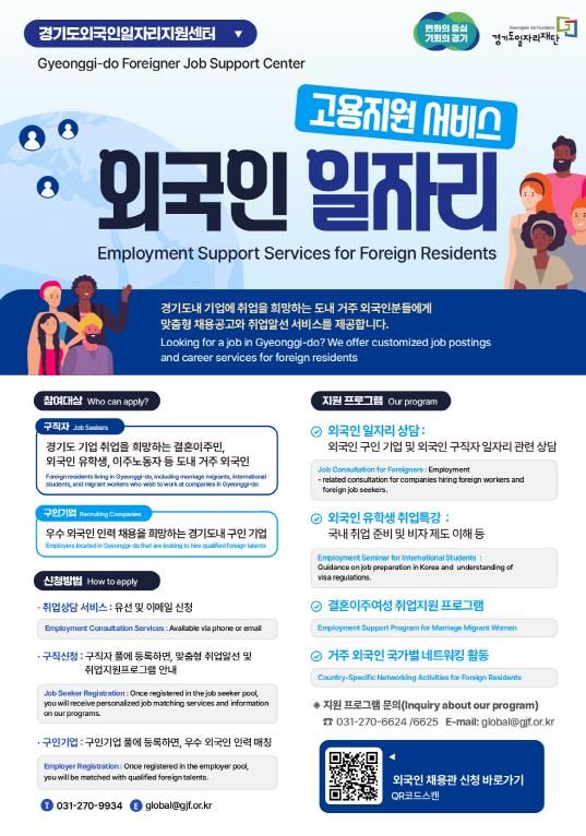 결혼이주민, 외국인 유학생, 이주노동자 등 경기도에 거주하는 외국인을 주요 대상으로 운영하고 있다. 경기도일자리포털 ‘잡아바’를 통해 신청할 수 있으며, 외국인 취업지원 프로그램 안내와 함께 맞춤형 일자리 알선 서비스를 받을 수 있다.