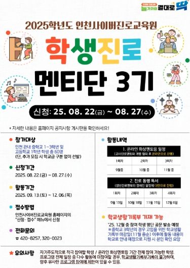 (아름다운교육신문) 인천광역시교육청 인천사이버진로교육원에서는 8월 22일부터 ‘학생진로멘티단 3기’를 모집한다.