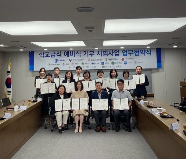 (아름다운교육신문) 경기도수원교육지원청은 8월 21일, 수원시청 상황실에서 수원특례시청, 수원지속가능발전협의회, 수원시자원봉사센터, 사업 참여 8개교, 광교종합사회복지관, 우만종합사회복지관과 ‘학교급식 잔식 기부 시범사업’ 업무협약을 체결하고, 9월부터 참여학교 및 유관기관과 함께 본격적으로 사업을 추진한다.