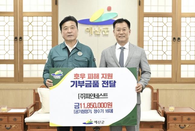 (아름다운교육신문) 예산군은 ㈜파인네스트로부터 집중호우 피해로 어려움을 겪고 있는 이재민들을 위해 1000만원 상당의 정수기와 공기청정기 총 16대를 기탁받았다고 22일 밝혔다.