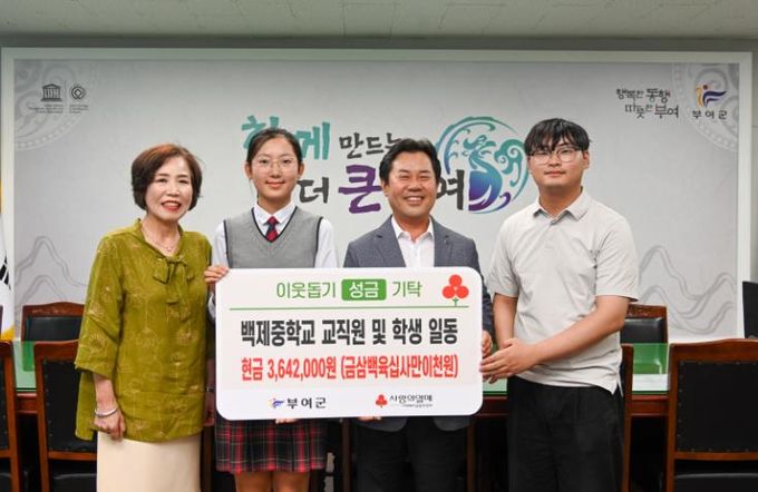 이에 박정현 부여군수는 “백제중학교 학생들과 교직원들의 이웃사랑과 따뜻한 마음에 깊이 감사드리며, 이러한 마음이 지역사회에 큰 힘이 되어 어려운 이웃들에게 큰 희망이 될 것이다.”라며 감사의 마음을 전했다.