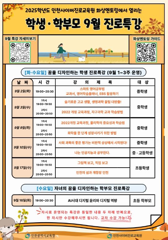 인천시교육청 관계자는 “이번 특강은 학생들에게 교과 학습을 기반으로 진로를 탐색할 기회를 제공하고, 학부모에게는 디지털 시대 자녀 교육의 방향을 고민할 수 있는 시간이 될 것”이라며 “앞으로도 학생과 학부모를 위한 맞춤형 진로 지원 프로그램을 확대해 나가겠다”고 말했다.