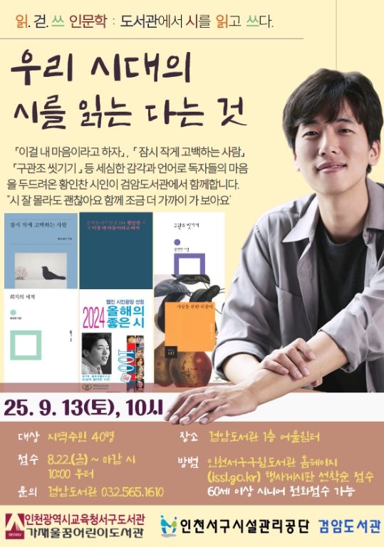 (아름다운교육신문) 인천광역시교육청서구도서관은 2025년 ‘지자체 연계 읽걷쓰 수요인문학’ 첫 번째 프로그램으로 9월 13일 오전 10시, 검암도서관에서 황인찬 시인 초청 강연을 진행한다.