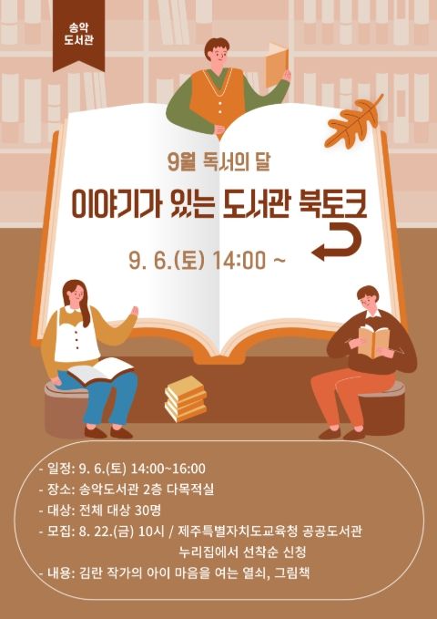 (아름다운교육신문) 제주도교육청 송악도서관은 9월 6일 오후 2시 도서관 2층 다목적실에서 ‘이야기가 있는 도서관 북토크’ 프로그램을 운영한다.