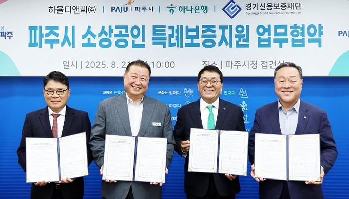 (아름다운교육신문) 파주시는 지난 21일 하율디앤씨㈜, 하나은행, 경기신용보증재단과 함께 소상공인 특례보증지원을 위한 협약식을 개최하고 소상공인을 위한 실질적인 금융 지원에 나선다.