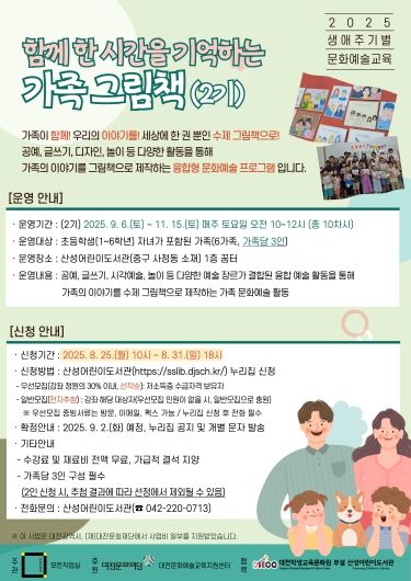 (아름다운교육신문) 대전학생교육문화원 부설 산성어린이도서관은 건강한 가족 문화 조성을 위하여 2025년 생애주기별 문화예술교육 '함께 한 시간을 기억하는 가족 그림책' 2기를 9월부터 세 달간 운영한다고 밝혔다.