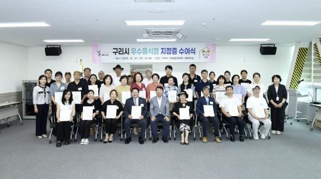 (아름다운교육신문) 구리시는 지난 21일, 구리시여성행복센터 4층 대회의실에서 ‘2025년 구리시 우수음식점 지정증 수여식’을 갖고, 올해 신규 선정된 ‘와구리맛집’과 ‘노포식당’ 등 우수음식점 40개 업소들에게 지정증과 표지판을 전달했다.