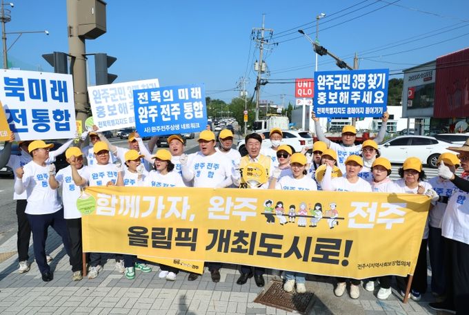 완주·전주 통합운동을 펼치고 있는 완주·전주 상생발전네트워크(회장 박진상, 이하 상생발전네트워크)는 22일 서전주아울렛 삼거리 일대에서 우범기 전주시장과 50여 명의 회원들이 참석한 가운데 완주·전주 통합의 필요성과 당위성에 대한 시민 공감대를 높이기 위한 ‘완주전주 통합 염원을 담은 범시민 출근길 통합 캠페인’을 전개했다.