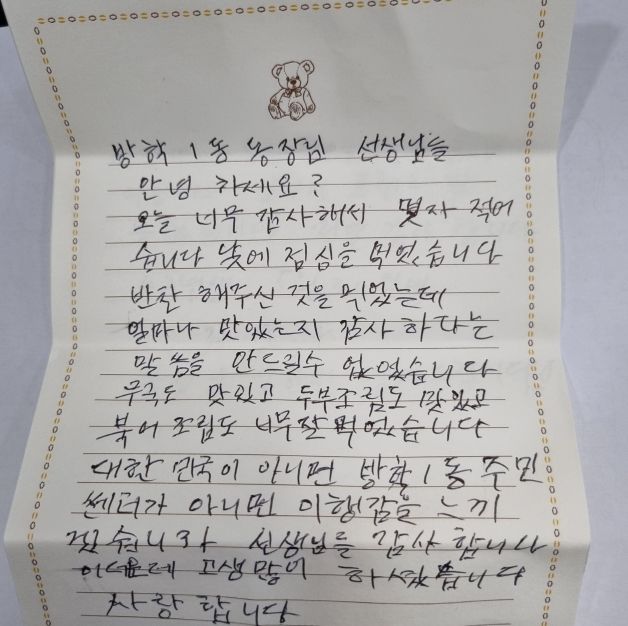 (아름다운교육신문) 서울 도봉구방학1동에 홀로 거주하고 있는 어르신 A씨(83)가 방학1동주민센터에 보낸 손 편지 내용이 지역사회에 잔잔한 감동을 주고 있다.