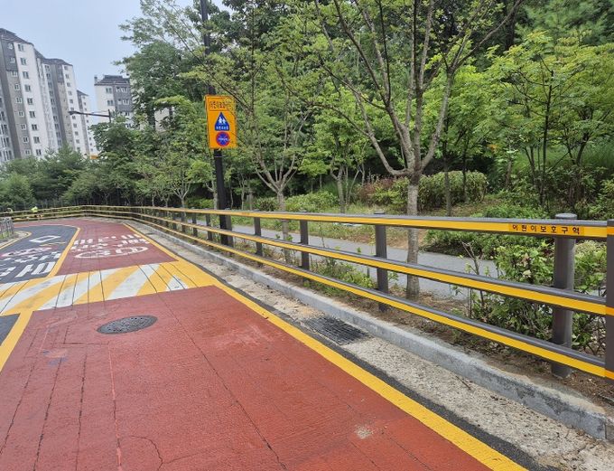 구는 어린이보호구역 보행자 안전 강화 대책의 하나로 율화유치원, 성심유치원 등 7개 시설, 9개 구간에 노후되거나 차량 충돌 등으로 파손되어 흔들리는 보행자용 방호울타리를 교체하거나 신규 설치했다.