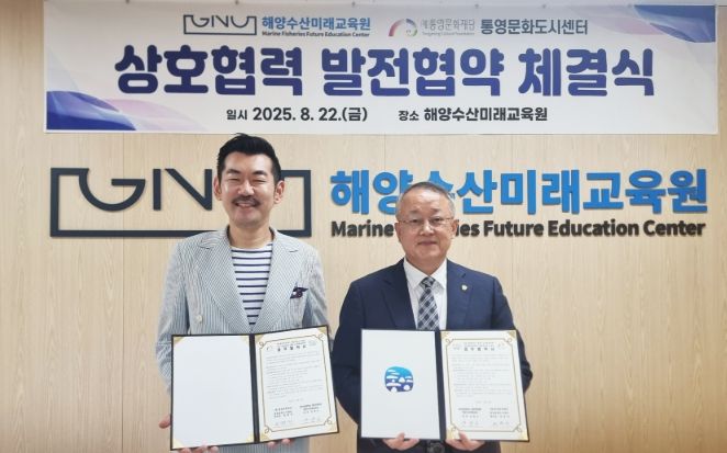 (아름다운교육신문) 경상국립대학교 해양과학대학 해양수산미래교육원과 (재)통영문화재단 통영문화도시센터는 8월 22일 해양수산미래교육원에서 해양수산 미래 인재 양성과 지역문화 발전을 위해 업무협약(MOU)을 체결했다.