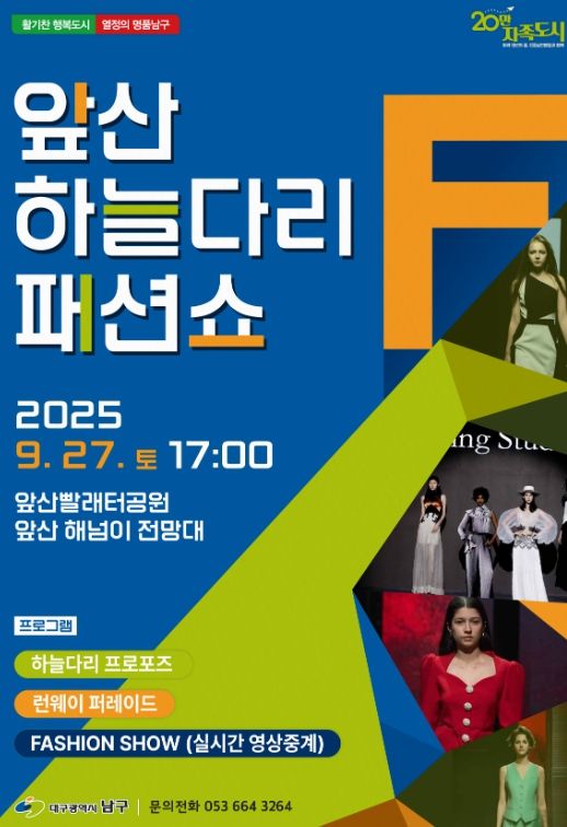 (아름다운교육신문) 대구 남구는 오는 9월 27일 지역의 대표 관광명소인 앞산빨래터공원에서 하늘다리 패션쇼와 프러포즈 이벤트를 개최한다고 밝혔다.