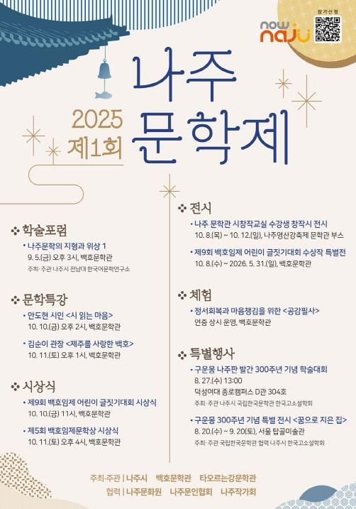 (아름다운교육신문) 전라남도 나주시가 문학 진흥과 관광 활성화를 위해 오는 9월부터 10월까지 제1회 나주문학제를 개최하고 학술포럼과 특강, 문학상 시상식, 전시 등 다채로운 프로그램으로 나주문학의 위상과 가치를 널리 알린다.