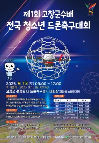 (아름다운교육신문) 고창군이 오는 13일 고창 꽃정원(고창읍 노동리 35)에서 ‘제1회 고창군수배 전국 청소년 드론축구대회’를 개최한다고 밝혔다.